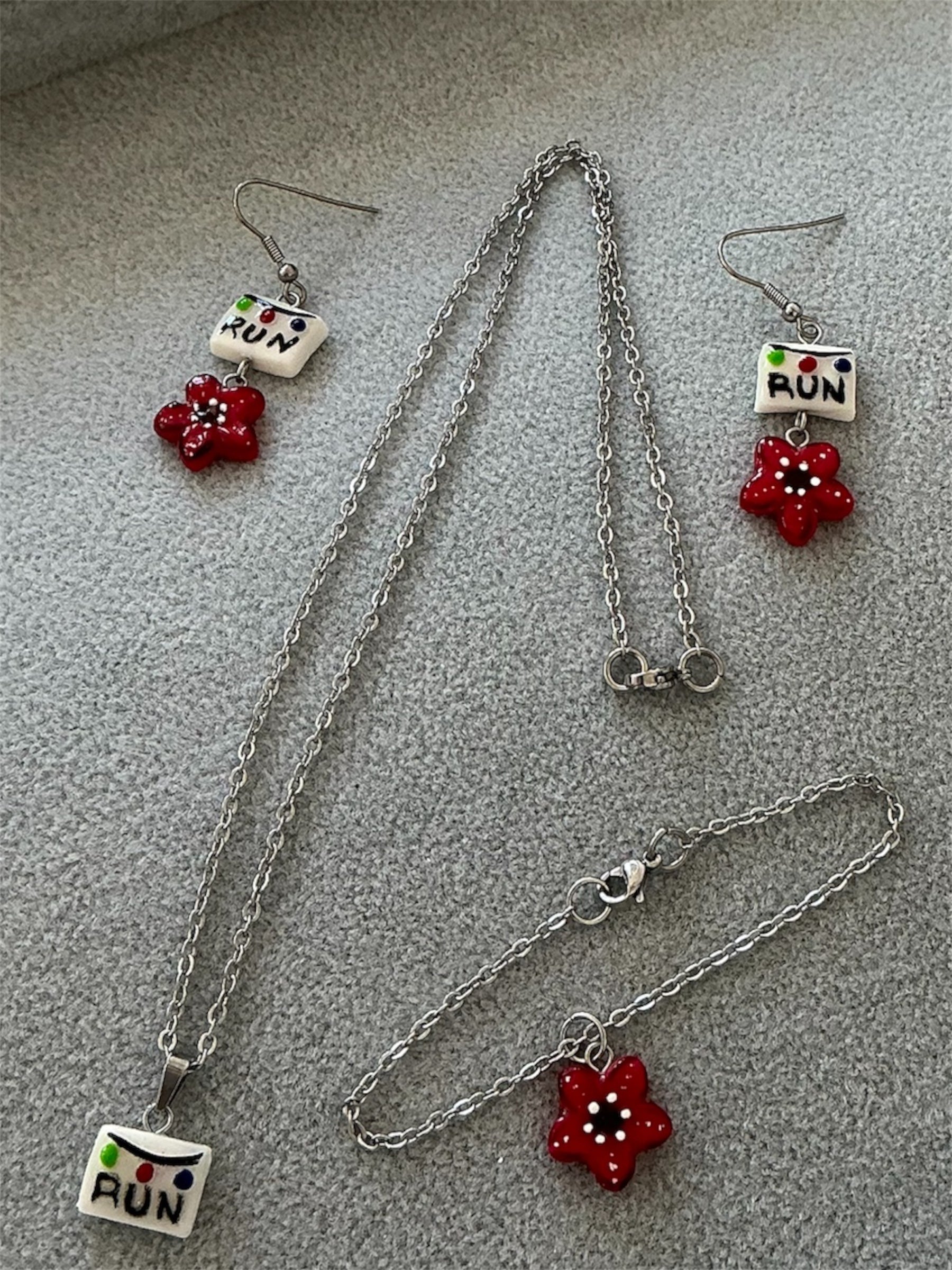 Collar, aretes y pulsera Stranger Things, set joyería acero inoxidable con dijes temáticos 3pz